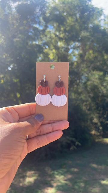 Celebrate fall in style with these handmade polymer clay pumpkin earrings 🍂. Each pair features a stacked pumpkin design in warm autumn colors, brown, orange, and white, making them the perfect accessory for pumpkin spice season!